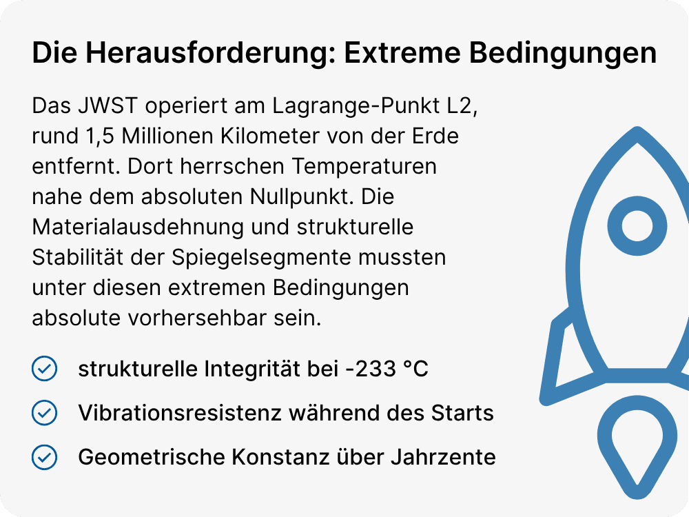 Wartungsmissionen, wie sie beim Hubble-Teleskop möglich waren, sind beim JWST ausgeschlossen. Jede Komponente musste beim ersten Versuch perfekt funktionieren. Das erfordert Fertigungsprozesse, die absolute Wiederholgenauigkeit garantieren.